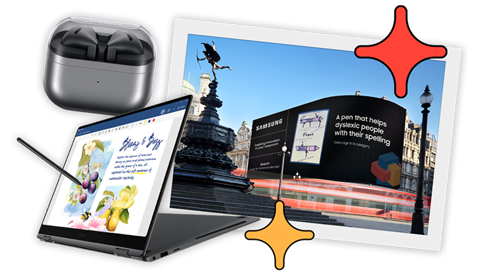 Samsung Galaxy Books, Galaxy Earbuds, mentoring and work experience, and idea displayed on the big screen in Piccadilly Circus!